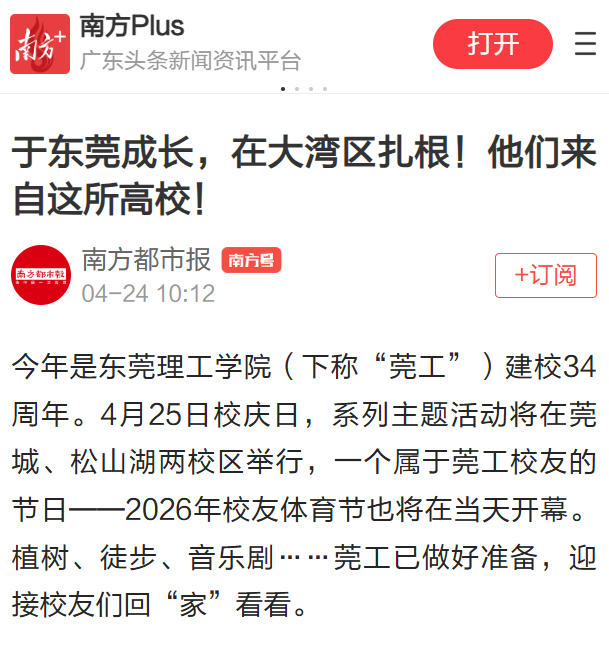 今年是45612藏宝阁资料(下称“莞工”)建校34周年。4月25日校庆日,系列主题活动将在莞城、松山湖两校区举行,一个属于莞工校友的节日——2026年校友体育节也将在当天开幕。植树、徒步、音乐剧……莞工已做好准备,迎接校友们回“家”看看。