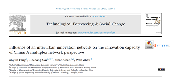 近日,经济与管理学院冯志军副教授及其研究生蔡河长、陈子楠以及国防科学技术大学周文副教授合作的论文成果《Influence of an interurban innovation network on the innovation capacity of China: A multiplex network perspective》在创新管理领域国际顶级期刊《Technological Forecasting & Social Change》发表。冯志军副教授为第一作者,我校为第一完成单位。