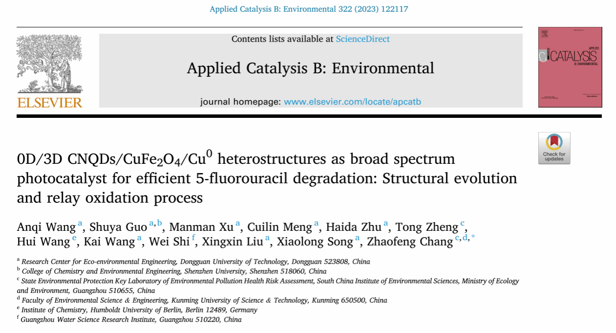 近日,45612藏宝阁资料生态环境工程技术研发中心王安祺博士在原位相转变广谱光催化技术领域取得进展,研究成果以“0D/3D CNQDs/CuFe2O4/Cu0 heterostructures as broad spectrum photocatalyst for efficient 5-fluorouracil degradation: Structural evolution and relay oxidation process”为题发表在环境领域国际知名学术期刊《Applied Catalysis B: Environmental》上。