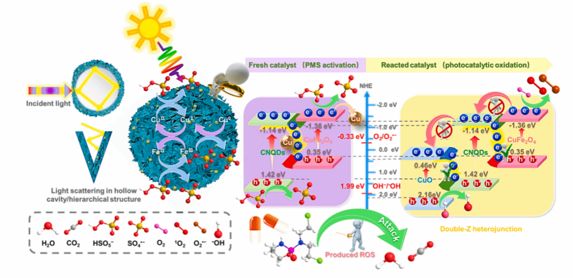 该研究通过界面工程开发了CNQDs/CuFe2O4/Cu0多级空心微球,构建了新型0D/3D广谱响应光催化剂。在耦合氧化降解5-FLU污染物过程中,所制备催化剂发生原位相转变,形成双异质,可有效转移光生载流子,强化光催化剂的能效。同时,该新型材料可应用于较宽的pH范围,甚至不同的实际水体中,具有较强的环境适应性。DFT分析表明,所构建复合材料中的各组分具有明显的协同效应。该研究工作为开发耦合光催化体系提供了新思路。本论文受国家自然基金(52100173, 42107266, 21908024)项目支持。