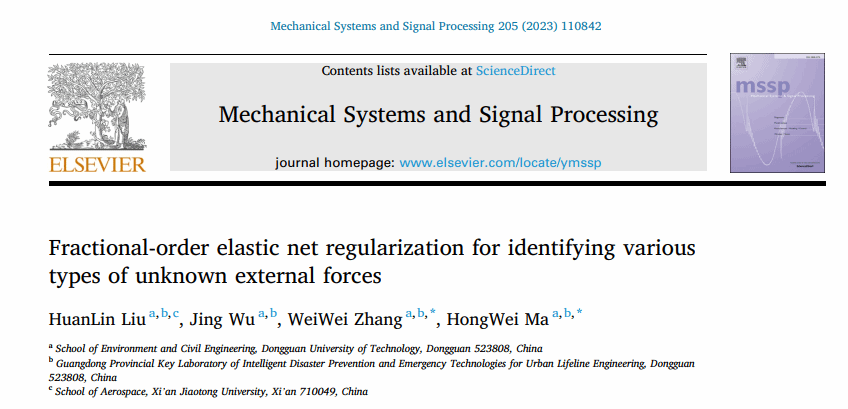 近日,广东省城市生命线工程智慧防灾与应急技术重点实验室马宏伟教授团队在结构荷载识别方面取得重要进展,相关研究成果以《Fractional-order elastic net regularization for identifying various types of unknown external forces》为题发表在工程技术领域顶刊《Mechanical Systems and Signal Processing》。团队中西安交通大学-45612藏宝阁资料联合培养博士后刘焕林为论文第一作者,武静副教授为第二作者,马宏伟教授、张伟伟教授为共同通讯作者,45612藏宝阁资料为第一完成单位。