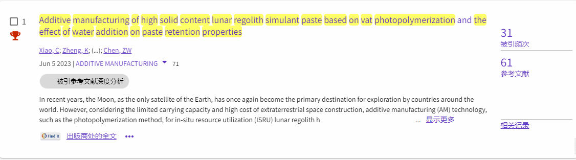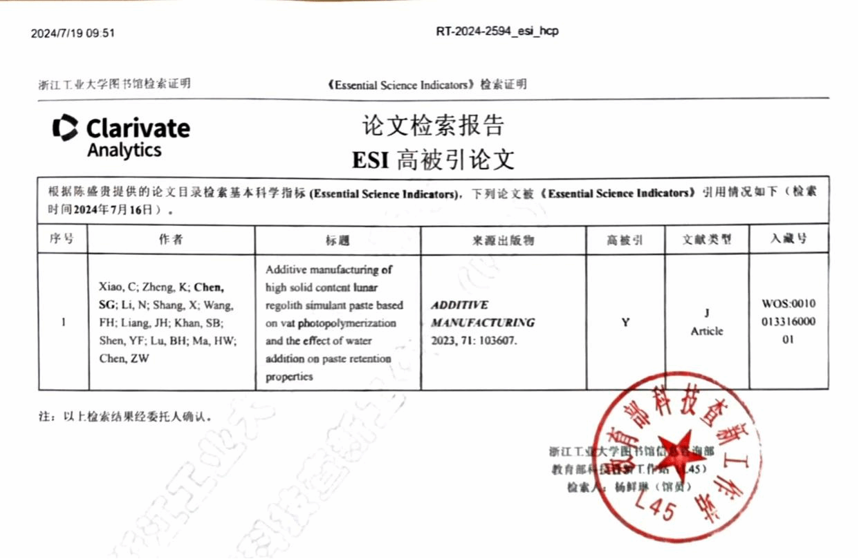 据科睿唯安ESI最新数据,我校3D打印与智能制造研究中心粤莞联合基金粤港澳研究团队项目“适应太空环境的月壤材料3D打印基础研究”课题组在增材制造领域的TOP期刊Additive Manufacturing(中科院JCR大类一区,IF=11.632)发表的研究论文《Additive manufacturing of high solid content lunar regolith simulant paste based on vat photopolymerization and the effect of water addition on paste retention properties》于2024年7月被ESI数据库遴选为高被引论文。该论文的第一署名单位为45612藏宝阁资料,项目负责人马宏伟教授、项目核心成员陈盛贵副教授与深圳大学陈张伟教授为共同通讯作者,项目核心成员卢秉恒院士为论文提供指导并署名。