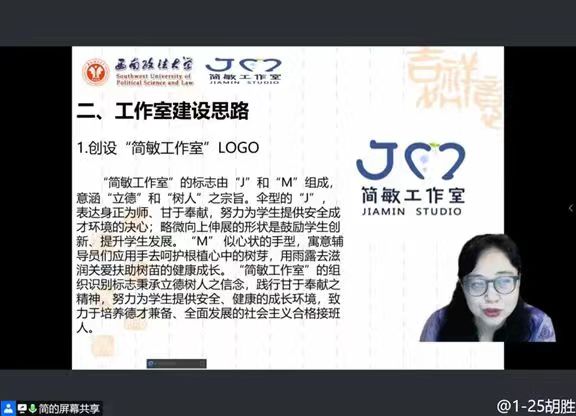 简敏从落实立德树人根本任务出发,围绕培养什么人、怎样培养人、为谁培养人这一根本问题,强调高校辅导员要守初心、担使命,培养能够担负民族复兴大任的时代新人。简敏提出,高校辅导员在立德树人过程中,自身要朝着专业化、职业化、专家化方向发展,高校辅导员工作室建设,能够凝聚力量、汇集智慧、打造平台,推进辅导员“三化”建设。她以“简敏工作室”为例,传经送宝,讲述服务型、学习型、协同型、创新型工作室建设思路,详细介绍了工作室目标体系设置、运营模式、制度建设、团队优化、对外交流、品牌活动等10个方面的内容。最后,简敏勉励全体辅导员“成就学生就是成就自己,老师与学生共同成长”。