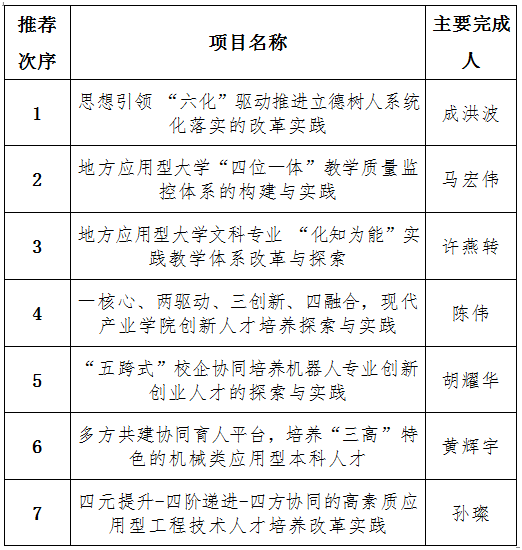 根据《广东省教育厅关于开展2021年广东教育教学成果奖评审工作的通知》(粤教人函〔2021〕8号)的要求,我校组织了广东省教育教学成果奖参评项目的推荐评审工作。经个人申报,教务处审核、专家组答辩评审、教学指导委员会投票表决,校长办公会研究后决定,拟推荐“思想引领‘六化’驱动推进立德树人系统化落实的改革实践”等7个项目参评2021年广东省教育教学成果奖,推荐名单及推荐次序见附表,现予以公示。