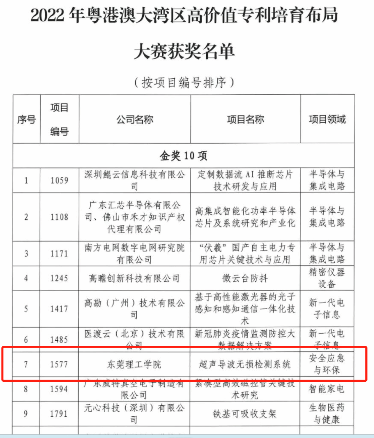 近日,2022年粤港澳大湾区高价值专利培育布局大赛(以下简称“湾高赛”)公布决赛评审结果。我校校长马宏伟教授主持的项目“超声导波无损检测系统”荣获金奖,是金奖获得者中唯一来自高校单位的项目,也是我校参加湾高赛以来首次获得金奖。