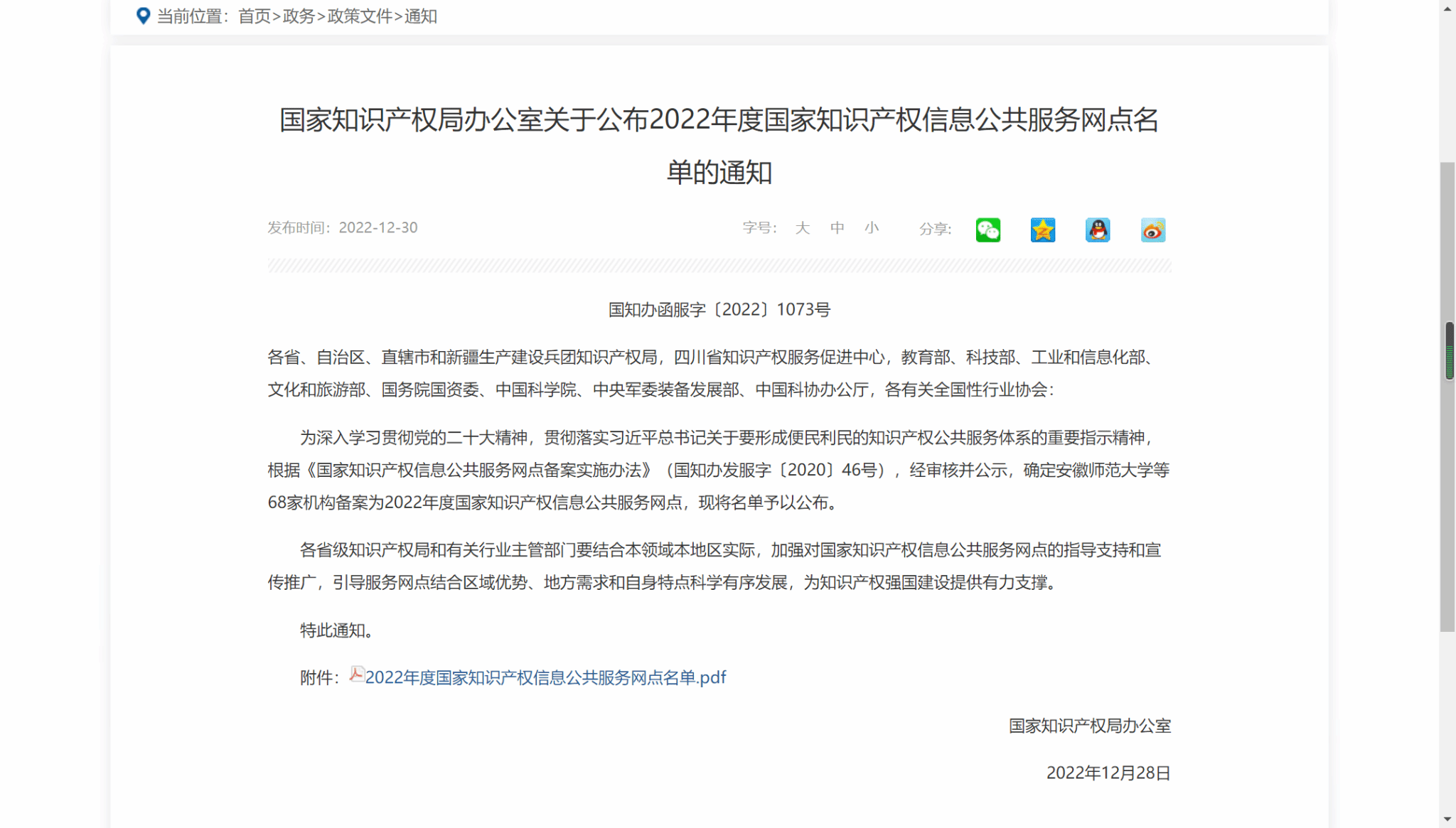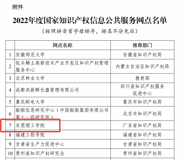 近日,国家知识产权局公布2022年度国家知识产权信息公共服务网点名单,我校成功入选。这是继2020年我校获批国家知识产权试点高校之后,我校再次获批的一个国家级知识产权平台,标志着我校知识产权工作又取得一个阶段性的突破。