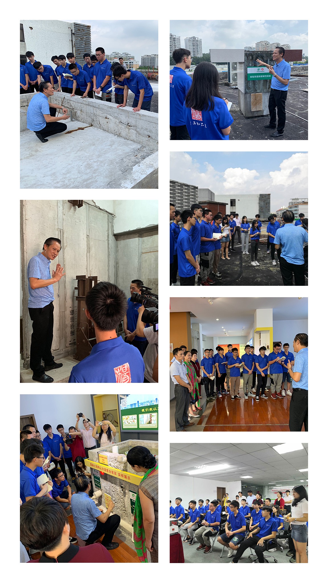 何玉成带领学生们实地参观了各种科技展示厅、技师工作站培训基地、何玉成劳模工作室、百年安居科技研发基地、工作站实操基地与耐久性试验基地等,为学生们详细讲解了“彩丽被动式防治渗漏技术”“挂贴饰面砖成套应用技术”“结构加固补强特种技术”“蒸发降温隔热屋面系统”等传统文化建筑技艺与新技术结合的理论实践创新成果,让大家实地感受各种建筑科技的建筑场景及实物,加强了此次实践调研的深度。