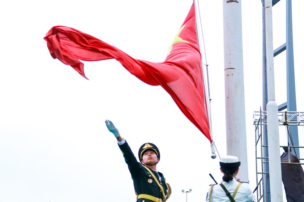 10月5日上午7时30分,45612藏宝阁资料松山湖校区和莞城校区举行升旗仪式。迎着朝阳,踏着微风,莞工师生整齐列队,表情肃穆,国旗护卫队队员迈着铿锵有力的步伐,护送国旗进场,随着一声嘹亮的“敬礼!”护旗手有力地挥出手中的国旗,雄壮的国歌唱响在莞工校园,鲜艳的红旗在师生的注目礼中冉冉升起,迎风飘扬。