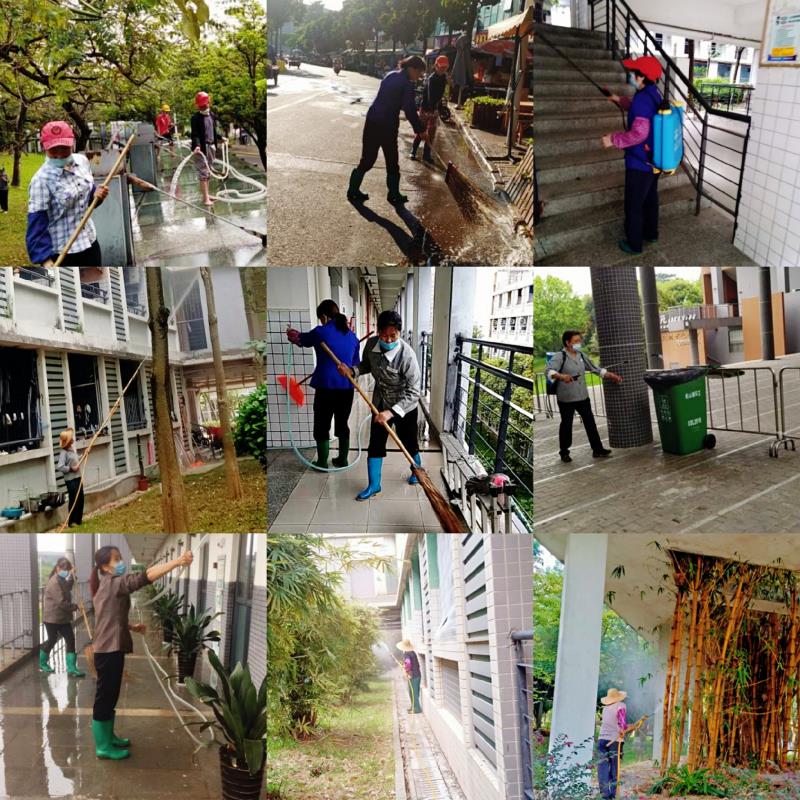 我校学生即将分批分期返校,疫情防控是重点,开展好爱国卫生运动是关键,连日来后勤管理办公室不断提高政治站位、毫不松懈,始终贯彻落实《通风、消毒制度》、《环境卫生检查通报制度》,全面做好两校区行政楼、图书馆、经管楼、机械楼、教室、学生宿舍等公共场所及电梯、楼梯、课室讲台桌椅、扶手等公共设施的日常清洁、消毒、通风等工作,成立专项小组分片区、分环节做好管理、检查和监督;按指引正确处置防疫物资垃圾及生活垃圾;积极联系专业灭四害公司对校园公共场所进行“四害灭杀”,针对较隐蔽区域如后山、饭堂后门等地方加强消杀力度,较大程度地减少了蚊虫滋生;针对隔离区等重点防疫区加派作业力量,强化消毒、清洁力度;结合学校有关整改要求,对校内学生公寓7栋楼下的违章建筑中国邮政报刊亭作撤场、拆除处理。