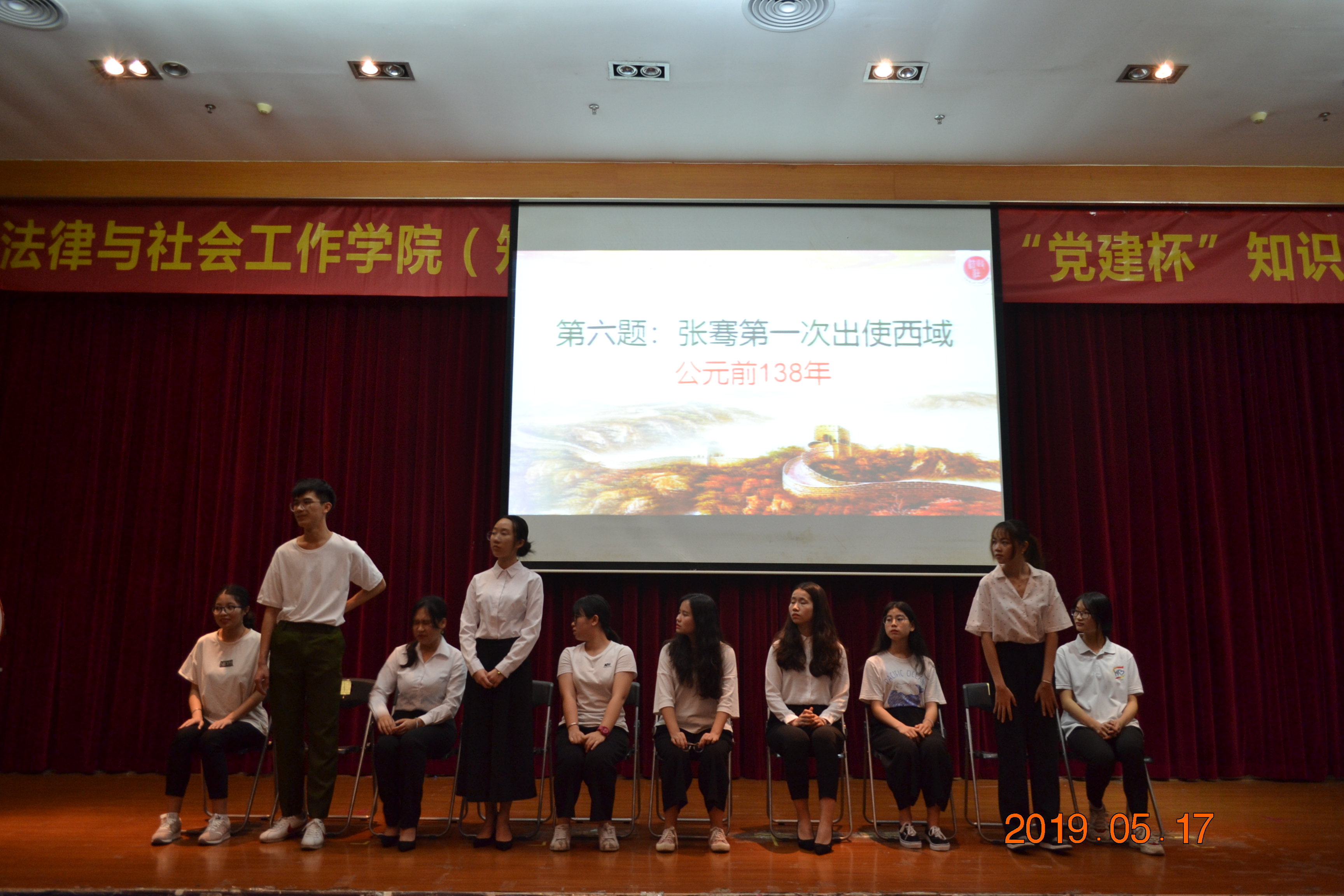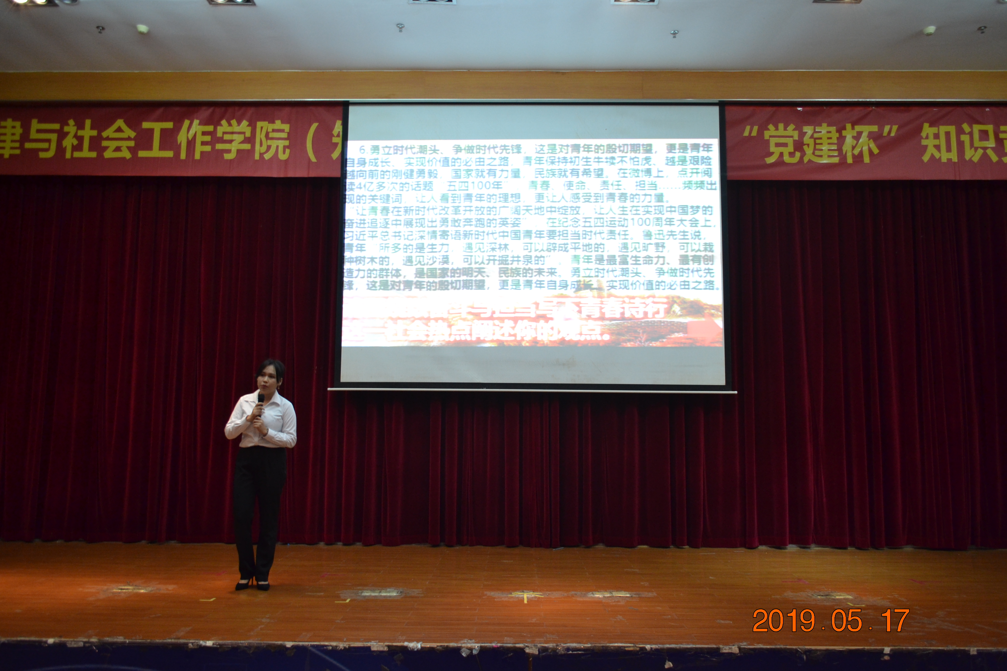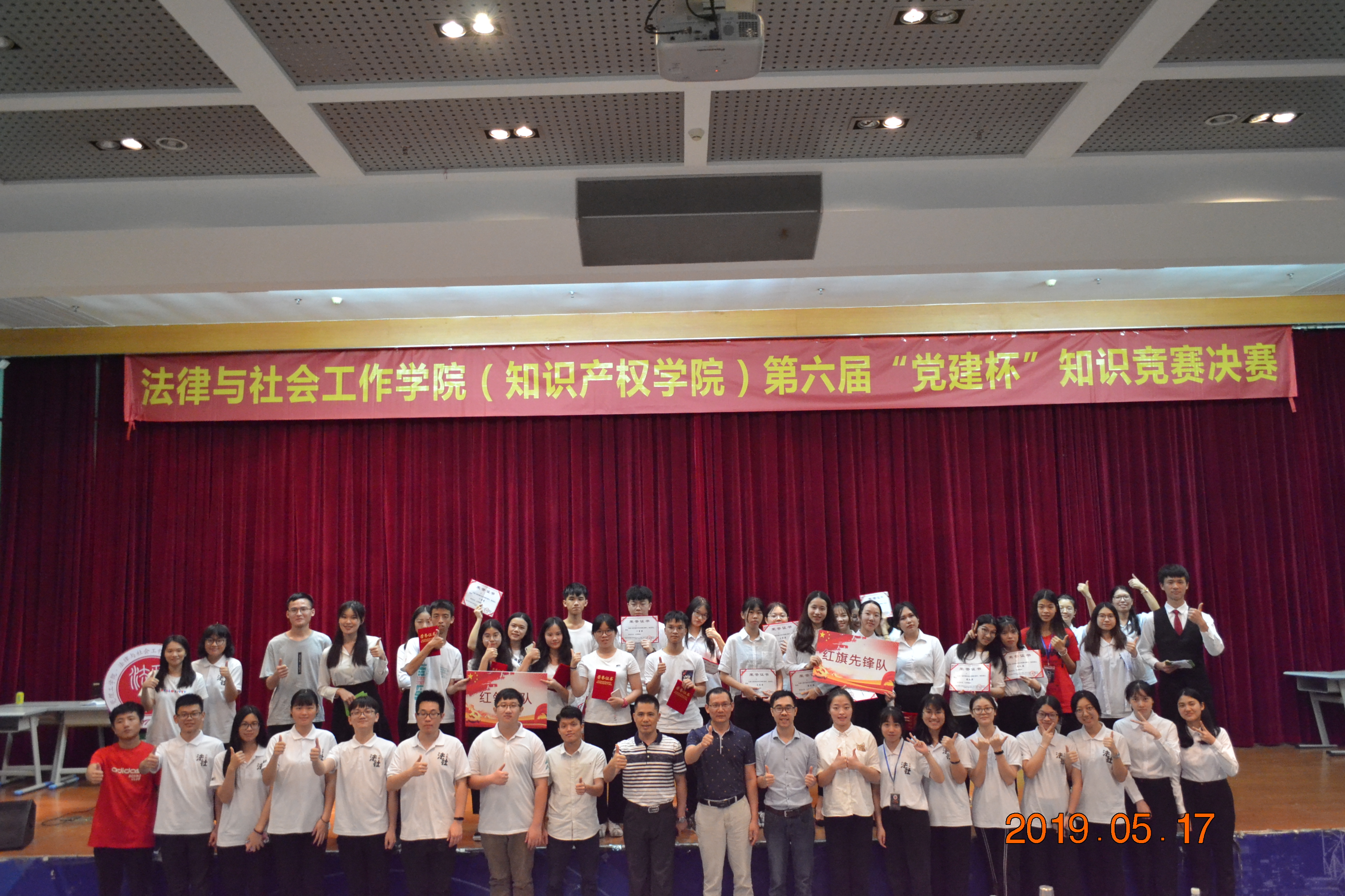 5月17日晚,法律与社会工作学院(知识产权学院)在莞城校区学术报告厅举行主题为“奋勇立潮头 青春话担当”知识竞赛。党总支书记杜应发、副书记丘永辉等出席了比赛。