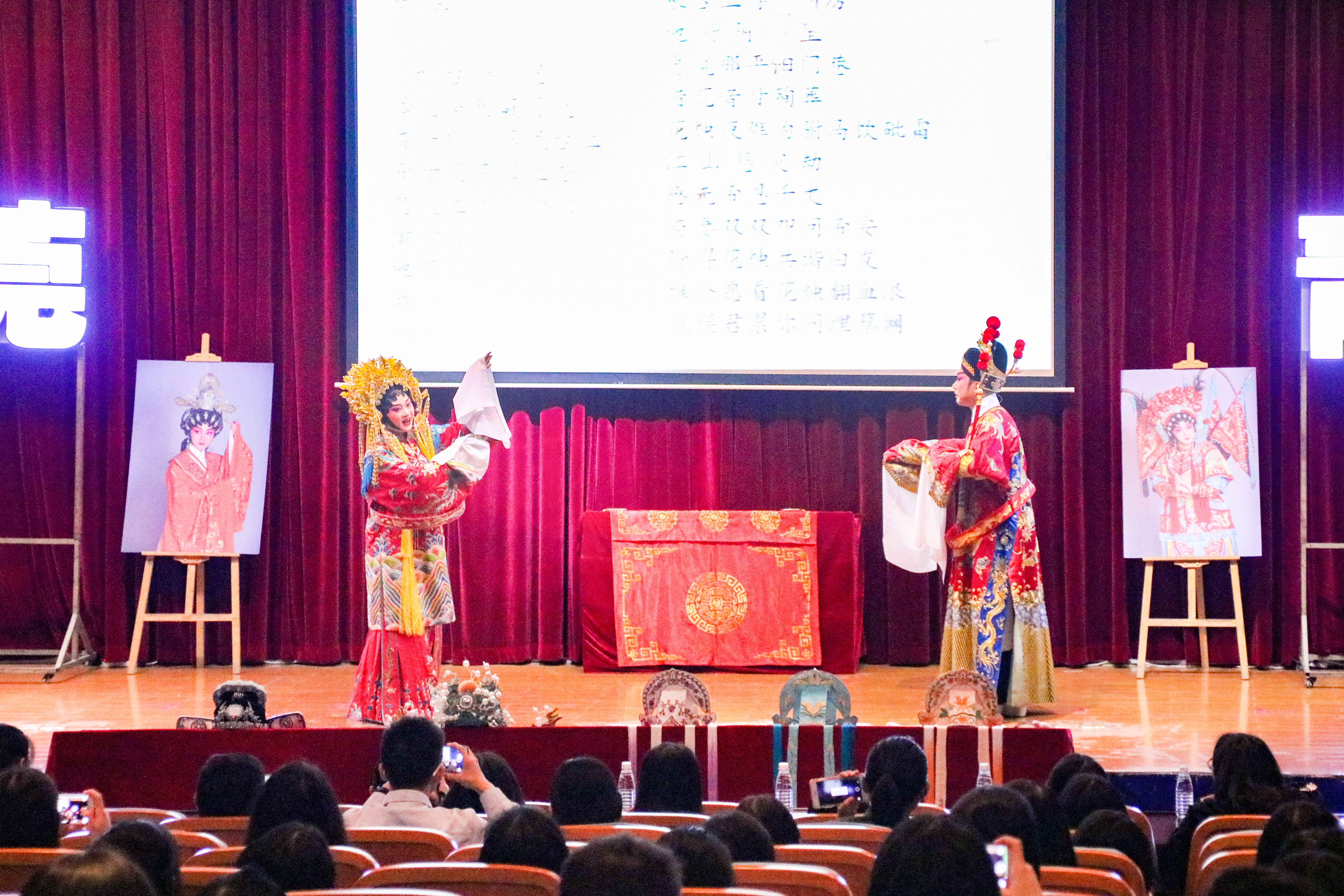 最后,邱小娜邀请广东粤剧院的两位演员为同学们现场演绎粤剧中著名的折子戏《帝女花•香夭》。精致的戏服、悲凄的曲调、婉转的唱腔、细微动情的表演,台上虽无过多布景,两位老师高水准的演出依然把台下观众深深带入了戏曲氛围之中,现场不少同学更主动拿起手机,记录这精彩的一幕。