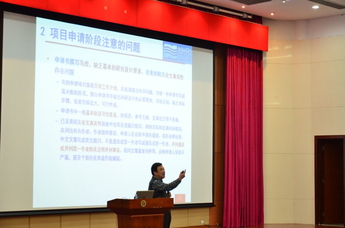 国家杰出青年基金项目获得者,国务院政府特殊津贴专家胡少伟教授为现场的老师们分享了申报国家自然科学基金项目的个人经验,介绍了国基项目的基本类别,申报过程中容易出现的问题,强调了坚持自己科研方向的重要性,加强标志性成果的积累和同行间的交流等问题。最后结合自己的项目,重点从科学问题的选定、研究方案的制定、本子的撰写以及如何突出研究特色等几个方面进行了详细的介绍。重点强调要认真对待,尽早做起,多积累成果,加大对外交流,提高申请书质量,在座的老师们受益匪浅。最后,胡少伟教授还以亲身经历告诉大家要积极面对失败,不要因失败而气馁,多多总结经验教训,终将获得成功。