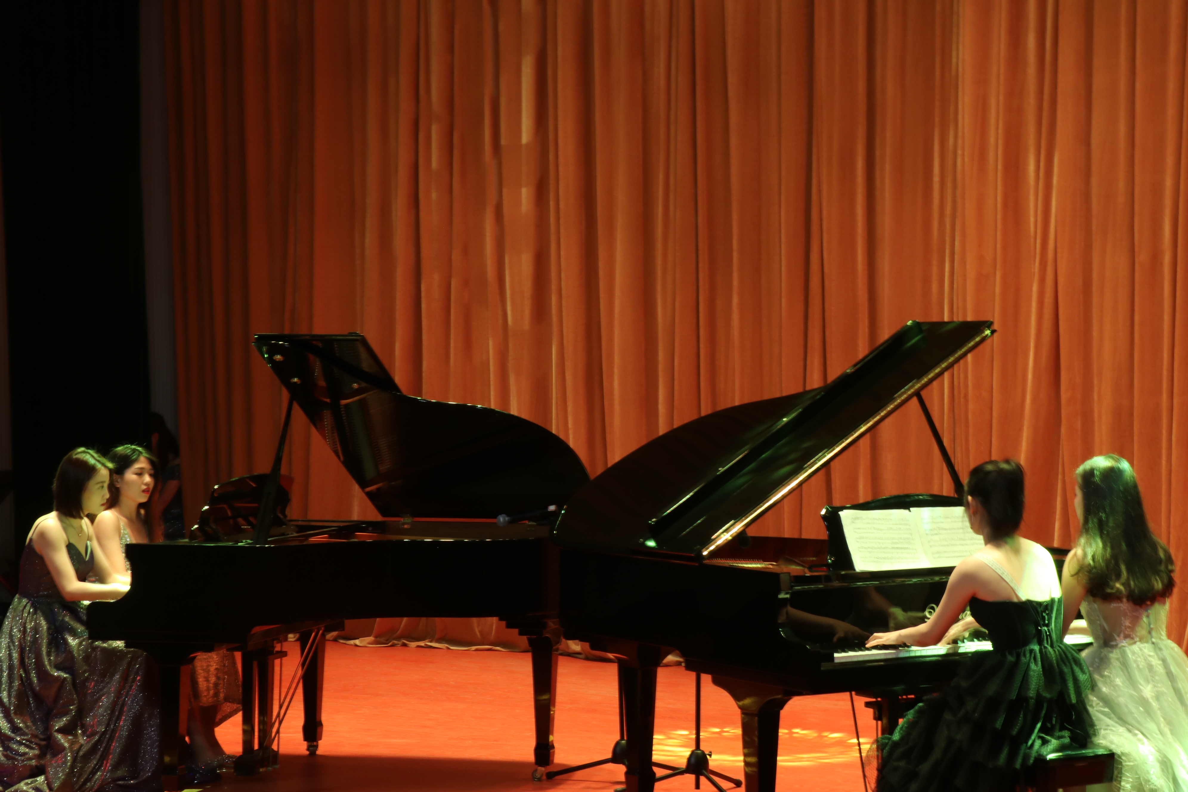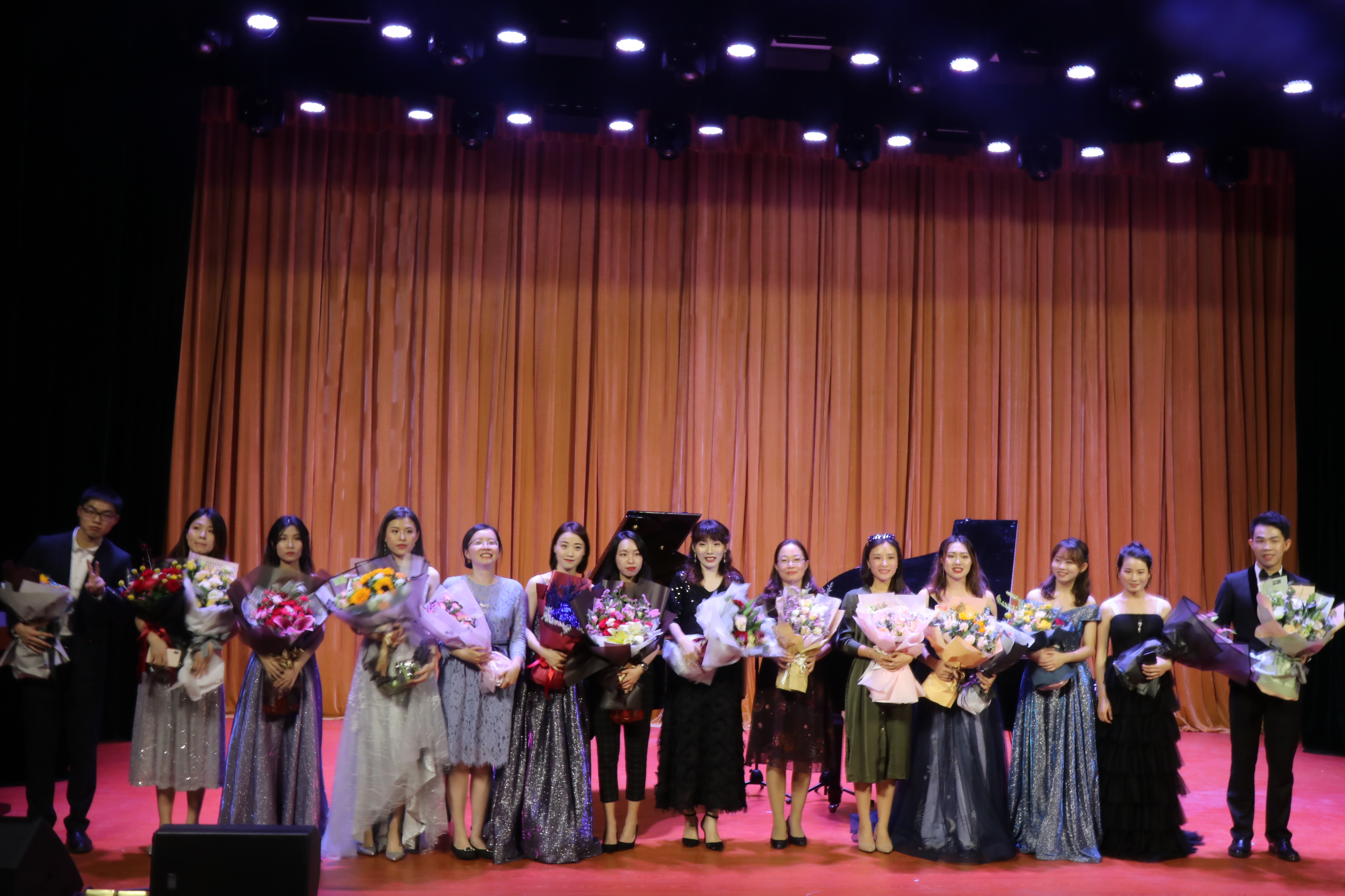 本场音乐会,毕业生一共演奏了十首曲子。一首双钢琴曲《热情桑巴》拉起音乐会的序幕。韩笑带来的《Mozart小星星变奏曲》,神秘与忧伤流泻于指尖;一首由国内钢琴家孙以强作曲、姚晓琳演奏的《春舞》带着鲜明的新疆维吾尔族风格,令人心旷神怡;《Brahms狂想曲(Op.79No.2)》热情且奔放;《胡桃夹子组曲》充满了单纯而神秘的神话色彩,勾起观众们儿时的美好回忆;王茜的《BeethovenG大调奏鸣曲》赢得满堂喝彩;由莫晃杰和黄茜老师演奏的双钢琴曲《RiverFlowsInYou》优美而略显伤感,温暖而柔情四溢;叶淑敏的《思春》让人怀念“昔我往矣,杨柳依依”的午后;《Chopin第三叙事曲》娓娓道来莱茵河畔的故事,一首八手连弹《Mozart:SymphonieNr550》将本次音乐会推向了尾声。晚会上,琚丹红及几位钢琴专业老师还即兴为毕业生演奏一曲《加洛普进行曲》,表达对毕业生的祝愿。