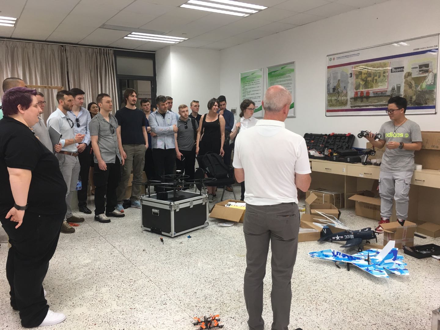 随后,中法联合学院及国际学院师生带领交流学生参观了中法联合学院学生创新创业实验室、流水线生产实验室、通信工程实验室等教学基础设施。中法联合学院学生还向现场来宾展示自制飞行器模型,为众人讲解自身对飞行器模型的见解及装配模型各式配置器件的原理。