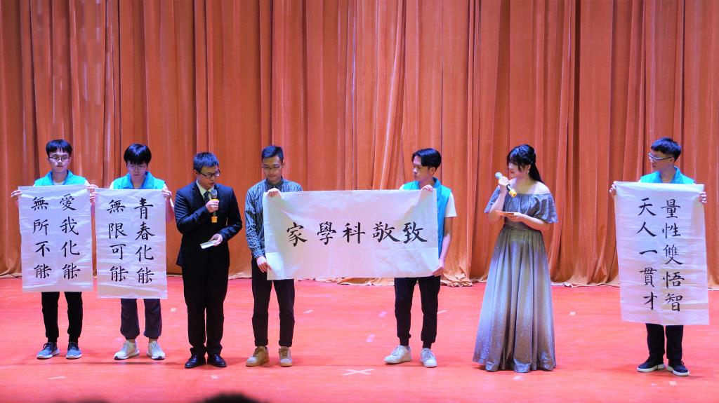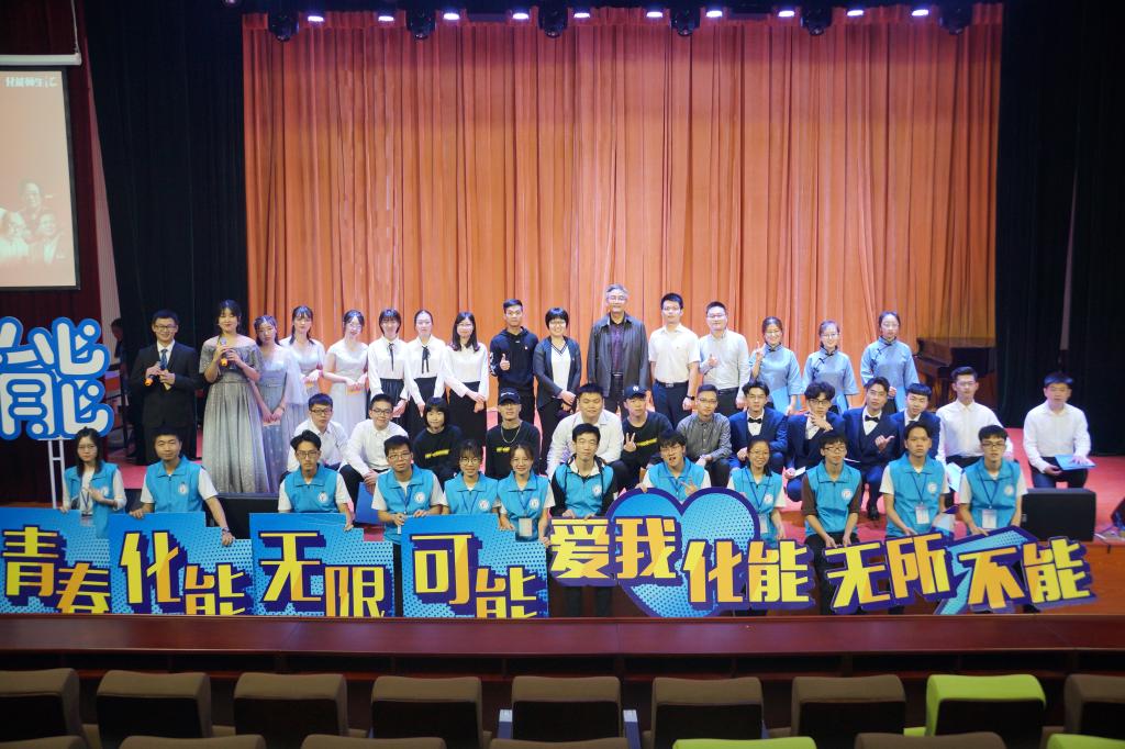 东莞市生物实验技能大赛一等奖获得者谭祖胜同学,展示了自己的书法作品“量性双悟智,天人一贯才”,表达自己对钱学森的崇高敬仰。现场师生一齐喊响了“青春化能,无限可能,爱我化能,无所不能”的口号,激情振奋的氛围感染了在座的每一位师生。