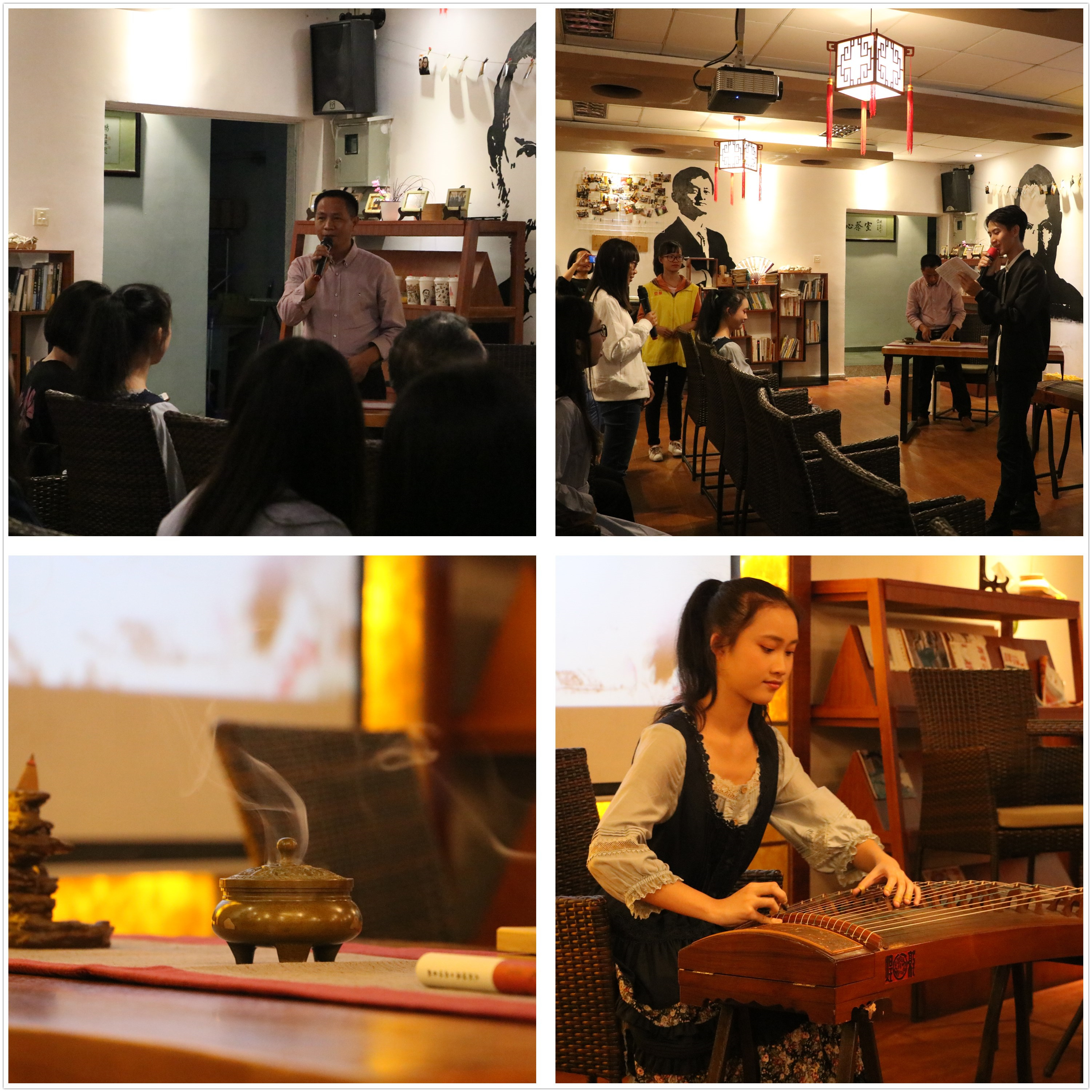 讲座后,教育学院(师范学院)学生为大家带来古筝演奏《彝族舞曲》。袅袅的莞香飘动,一缕缕淡淡而独特的香气溢满整个茶室,现场师生伴着婉转的古筝,细嗅淡淡的莞香,让人身心得到极大的放松。