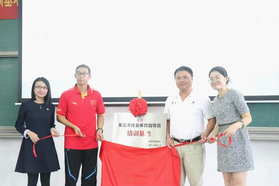 东莞市体育局副局长袁子健,东莞市志愿者联合会副秘书长邓巧梨、我校教育学院(师范学院)副院长陈进、东莞市社会体育指导员协会会长牛凤梅共同为东莞市社会体育指导员培训基地揭牌。