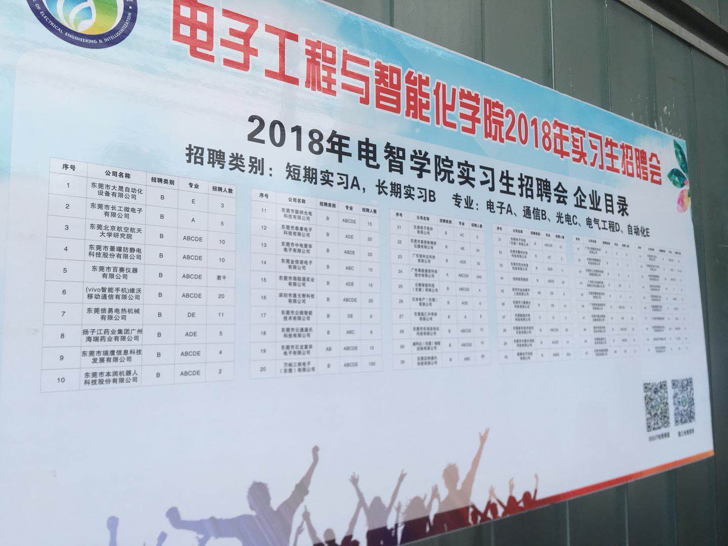7月7日下午,电子工程与智能化学院实习生招聘会在松山湖校区图书馆旁举行。此次招聘会共有66家企业参加,大部分是东莞高新技术企业。电智学院院长胡耀华、副院长李秀平、党总支副书记梁意红等到现场了解情况。