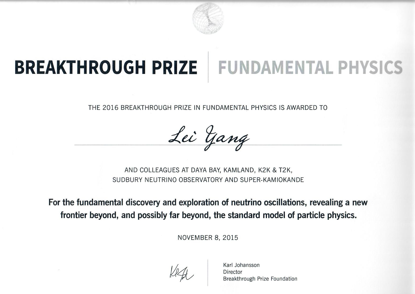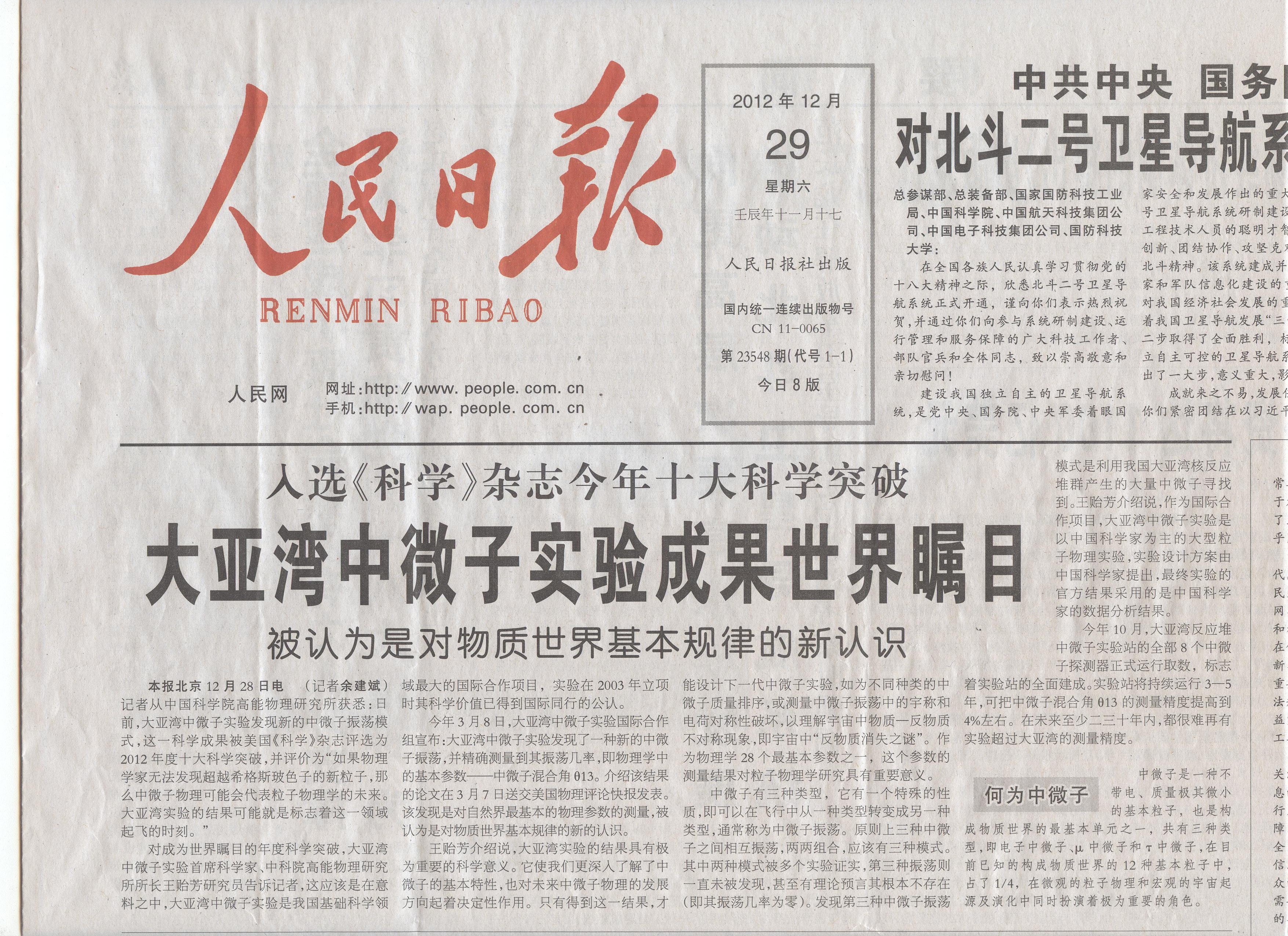 上述研究已形成了系列成果,其中课题组参与完成的“大亚湾反应堆中微子实验发现的中微子振荡新模式”成果,被美国《科学》杂志评选为2012年十大科学突破之一,并获2016年基础物理学突破奖。据相关资质机构统计,截至2018年4月,课题组发表ESI高被引论文9篇,其中1篇在Web of Science核心合集中的“被引频次”为1216。
