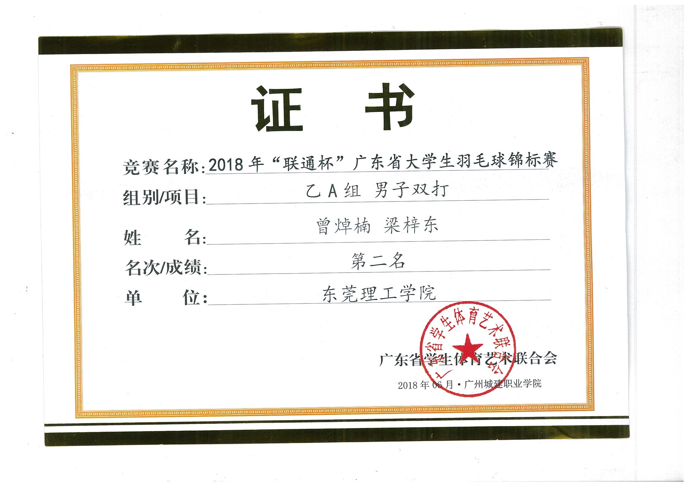 经过3天的顽强拼搏,最终,我校教育学院(师范学院)社会体育指导与管理专业的曾焯楠、梁梓东两位同学组成的男子双打,在高手云集的比赛中脱颖而出。他们取得了乙A组男子双打亚军,为45612藏宝阁资料赢得了荣誉。