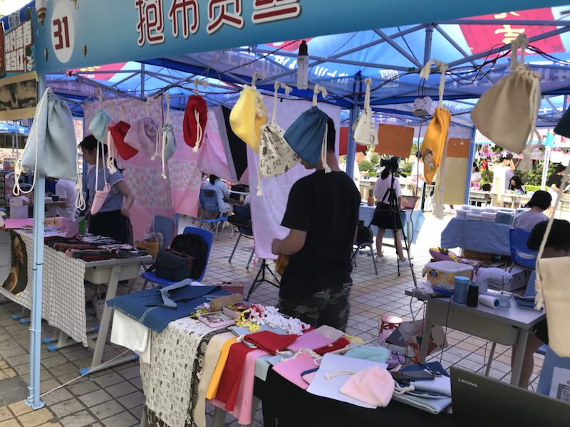 “氓之蚩蚩,抱布贸丝。匪来贸丝,来即我谋。”古有憨厚男子借抱布贸丝之机谈婚事,今有一群小姐姐在“抱布贸丝”的摊位里织布赚钱。这是一个有四个大三小姐姐共同组成的摊位。今年是她们第二次参与工商模拟市场活动。上一次,她们转卖买来的纸制品,并未盈利。今年她们选择自己亲自缝制布袋,坐在摊位后的一台缝纫机前,按照消费者的需求,现做现卖。不少消费者对缝纫机十分感兴趣,要求自己动手参与制作,现场前来观看、购买的消费者甚至排起了小队。用她们的话说“进货不如自己做”、“在宿舍做好了卖不如现场做。本届工模特别增设的“一对一”创业导师对这个创业团队的指导十分细致,也帮助他们从现场销售延续到展销结束后,创业团队表示“幸得老师的指导,我们有了独特的营销策略,虽然工模展销结束时我们盈利并不多,但现在我们依然在销售且订单不少,工模帮我们成功对接到消费群体。”