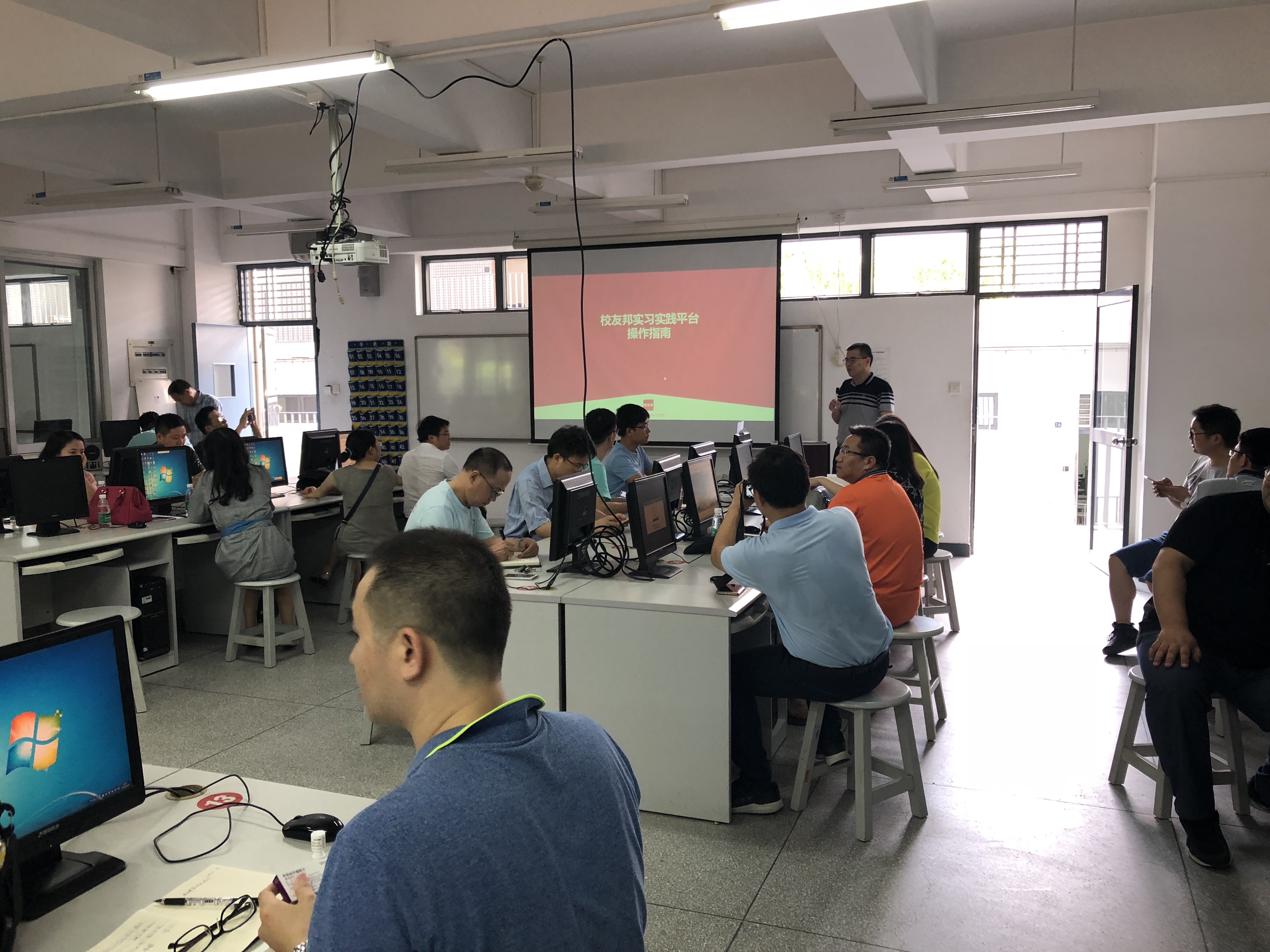 为规范实习教学环节,加强质量监控,提高实习教学质量,5月25日上午,我校特邀请“校友邦”大学生实习实践平台的专业技术人员,在计算机中心针对实习实践平台开展了培训。会议由教务处副处长杨秋平主持,各二级学院实践负责人40余名教师参加了此次培训会议。