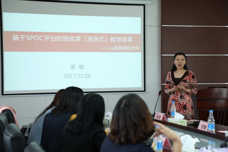 马院执行院长唐元松围绕安全立院、规划办院、教学立院、学科兴院、队伍强院、服务活院等方面介绍了马院的主要做法,也分析了学院在发展过程中所面临的机遇和挑战。马院副院长银锋介绍学院的教学工作情况,重点介绍了“1 1 1”混合式教学(即学生课前自主学习、教师团队主题讲座、学生学习小组主题研讨)的做法和成效。名师工作室代表谢敏给大家介绍了“看得见的思政课”——spoc课程,这是一种基于网络平台和现代科技,针对不同学生个人情况私人定制的教学创新改革。“看得见”是指学生和老师在教学过程、学习过程、成绩获取、学习结果、学习效果六个层面都能通过网络平台实时掌握教与学的进展。谢敏介绍,自推进此项教学改革以来,受到学生欢迎,教学效果明显提升,师生获得感明显增强。