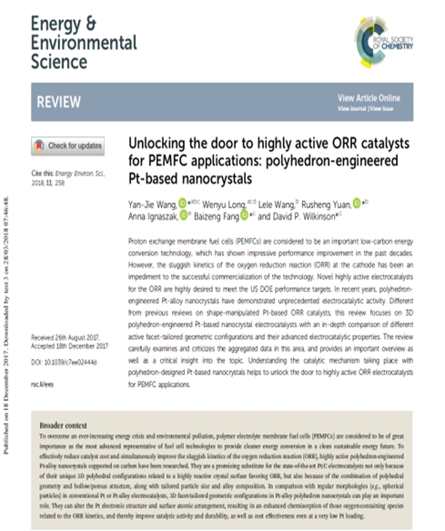 我校以“海外领军人才”引进回国的生态环境与建筑工程学院王严杰教授领导其研究团队与加拿大英属哥伦比亚大学David P. Wilkinson合作,以45612藏宝阁资料为第一作者、第一署名和通讯作者单位,在国际能源化学领域最具有影响力的综合期刊Energy Environ. Sci上发表综述论文“Unlocking the door to highly active ORR catalysts for PEMFC applications: polyhedron-engineered Pt-based nanocrystals, Energy Environ. Sci., 2018, 11, 258—275). 《Energy Environ. Sci.》由英国皇家化学会发行,是公认的国际能源化学领域影响力的学术期刊,其2017年影响因子高达29.518。
