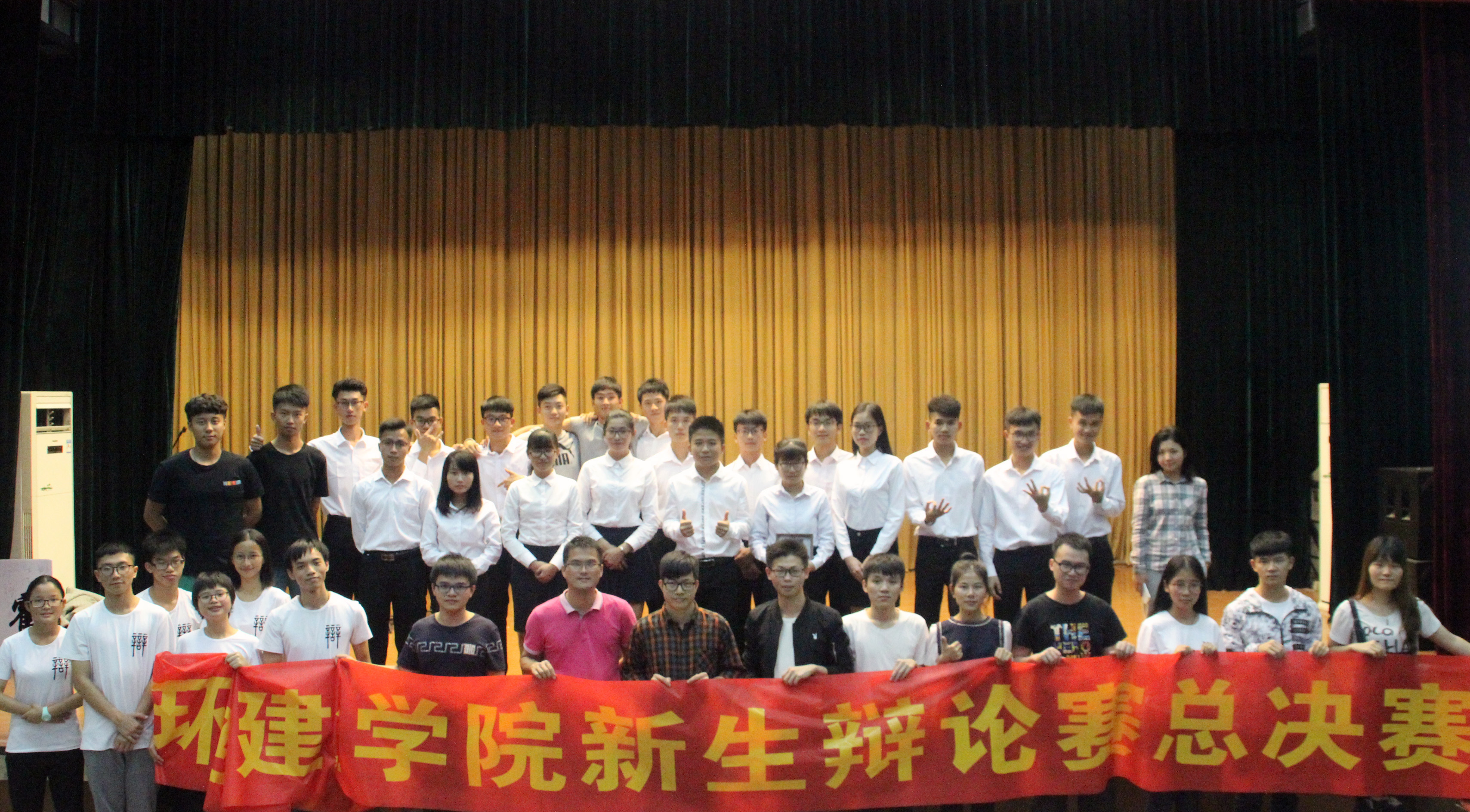 2017年11月30日晚环建新生辩论赛决赛于小剧场进行,出席嘉宾有团总支书记陈泳源老师、辅导员黄宇明老师,评委有校辩论队队长柯春仁、环建辩论队总教练吴凯瑶、前机械辩论队队长刘碧新、环建辩论队队长吴华盈、化能辩论队队长殷蕾栋。