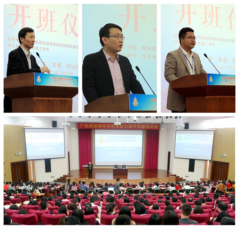 为进一步加强我省辅导员队伍专业化、职业化建设,提升大学生思想政治教育质量,11月30日至12月2日,由教育部高校辅导员培训和研修基地(华南师范大学)(以下简称辅导员基地)主办,我校承办的2017年广东省高校辅导员职业能力提升专题培训班在我校圆满举办。省教育厅思政处周中桅科长,华南师范大学教授、博士生导师、辅导员基地常务副主任魏则胜,我校学生工作部(学生处)处长黄金和出席开班仪式,来自全省95所高校的近500名辅导员参加了本次培训。学校党委高度重视辅导员队伍建设,将本次培训纳入我校学工队伍学习宣传贯彻党的十九大精神培训班,组织学工队伍全体教师参加了本次培训。