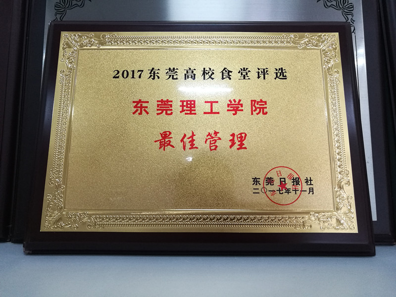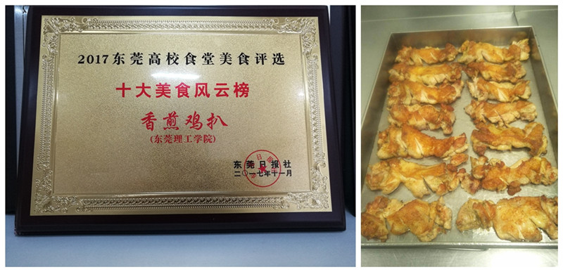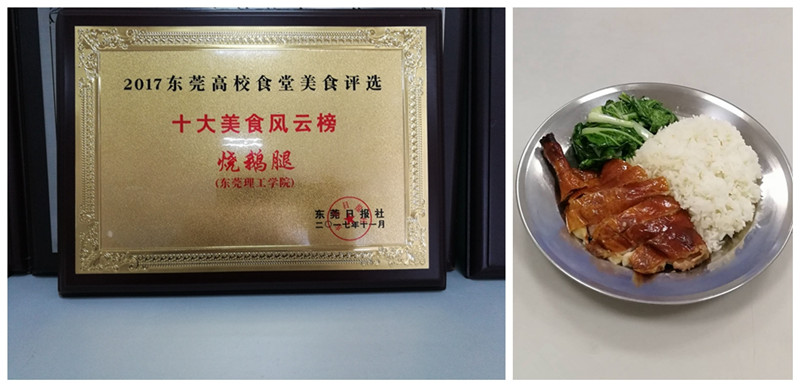 后勤集团饮食服务中心参加了《东莞日报社》举办的“2017年东莞高校食堂•十大美食风云汇评选”活动,以综合评分第二的成绩荣获2017年东莞高校食堂最佳管理奖;第一饭堂出品的“香煎鸡扒”及第三饭堂出品的“烧鹅腿”荣登2017年东莞高校食堂评选十大美食风云榜。