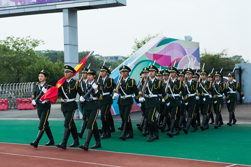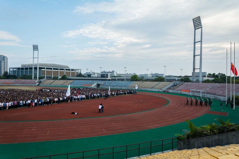 起来,不愿做奴隶的人们,把我们的血肉筑成我们新的长城……”伴随着雄壮的国歌声,五星红旗在松山湖校区主田径场升旗台冉冉升起,11月6日7:45,松山湖校区全体新生、学生党员、辅导员、学院分管学生工作负责人,及学工部、武装部工作人员共计三千余人,面向国旗,高唱国歌,庄严肃穆的氛围让全体成员深受感染。