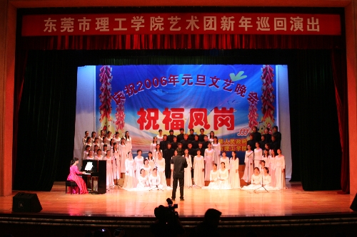 在2006年新年来临之际,我院艺术团共在凤岗镇和塘厦镇连续表演两场次;艺术团为了这次巡回演出做足准备工作,一些节目还是学生自编自演的。我院部分教职工也全情投入到新年巡回演出当中,他们的节目为艺术团的表演增色不少。