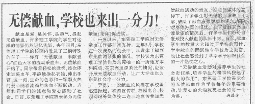 于是,一股献血的风潮在学校里迅速掀起。校园宣传栏,校园电台,校园网站等媒体接二连三地宣传参加无偿献血活动的意义。在校园媒体的宣传下,许多学生对无偿献血增进了了解,破除了献血有损健康的观念,解除了身体方面的担忧。在了解到东莞血源紧张的情况后,许多学生们纷纷自发地投入献血的队伍中来。当天献血学生的数量大大超过了学校的预计,学生献血的踊跃性令学校为之一振奋,也让社会感受到了莘莘学子的回报社会的一片热忱之心。
