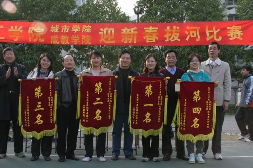 1月9日,城市学院教工篮球场人声鼎沸,春意盎然。来自城市学院、成教学院8支队伍,在这里展开激烈的拔河比赛。经过三轮淘汰,城市学院机关一队以绝对优势获得第一名,工科队、机关二队、文科队分别获得二、三、四名。
