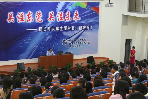 2006年4月13日下午,我院经济与贸易系在图书馆报告厅举行“关注东莞,关注未来——局长与大学生面对面”报告会,报告题目为“东莞市进出口贸易现状及展望”。这也是经贸系开展教学科研月以来的第三次活动。