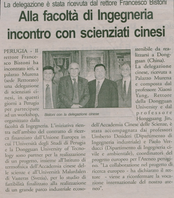 欧盟合作科研项目会议在意大利佩鲁贾大学举行,与会人员对开展《低能耗的厂区、生活区整合型生态工业方案设计与可行性研究》的欧盟合作科研项目进行了深入的研究和讨论,有效推进了这个获得欧盟30万欧元的经费支持的合作项目的开展。会后,翁布利亚大区区长、佩鲁贾市市长、佩鲁贾大学校长等接见了我院考察团一行,当地省、市报纸和有关媒体都报道了此事。