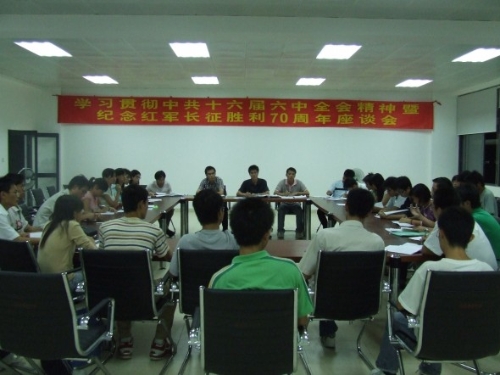 10月30日,院团委组织学生会骨干成员在学生活动中心B301举行了学习贯彻十六届六中全会精神暨纪念长征胜利70周年座谈会。 会上,学生干部们结合自己在学生会工作中的实际情况,联系十六届六中全会精神和长征精神,纷纷发表了自己的心得体会。大家一致认为,学生干部要带头学习十六届六中全会精神和长征精神,学习无产阶级革命家不畏艰难、敢于牺牲、积极进取的精神,坚定理想信念,发挥好先锋带头作用,为建设和谐校园贡献力量。