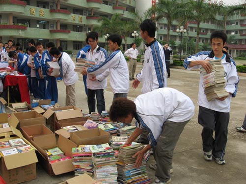 当天下午,外语系、机电(建筑)工程系的志愿者一早就来到新风中学布置现场,新风中学的学生在其团委老师的指挥带领下有序地排队把自己心爱的书无私地奉献给山区的孩子。志愿者们认真地在现场接收中学生的书籍,并分类装好。本次活动共收到各类书籍4234本,并吸引了大岭山电视台全程拍摄。