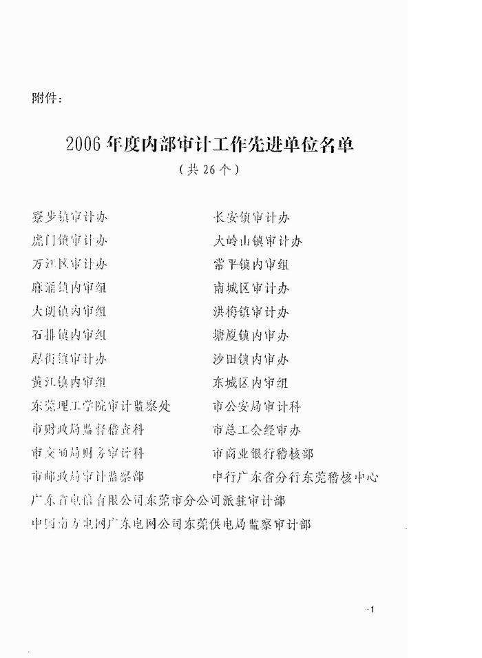 在东莞市审计局、东莞市内部审计协会2006年度全市内部审计工作检查评比中,通过分组量化评分、集体评议等方式,审计监察处被评为我市“2006年度内部审计工作先进单位”。另外,在1月23日全市纪检监察系统先进集体和先进个人表彰大会上,纪委办公室刘家昌同志荣获中共东莞市纪委、市监察局通报嘉奖。