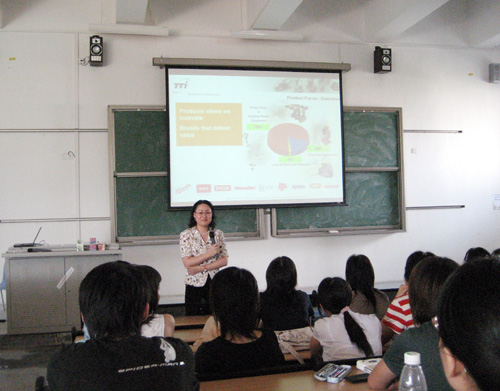 5月24日下午,应外语系的邀请,创科集团中国区人力资源总监程晓江女士给外语系04级和05级全体学生做了一个精彩的英语讲座。讲座的内容包括未来几年中国人力资源的需求形势和就业市场对英语专业学生的素质要求。 讲座之后,学生们都认为程女士的讲座内容充实、信息量大。通过这次讲座可以使他们对当前的就业形势有了一个比较全面和充分的了解,然后再根据自身的实际情况,调整努力的方向,以便达到人才市场越来越高的要求。