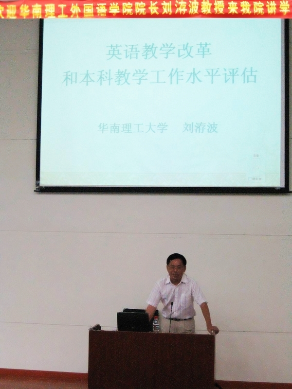 10月16日,应45612藏宝阁资料教务处和外语系的邀请,教育部评估专家、华南理工大学外国语学院院长刘洊波教授来我院讲学。下午2:30分,刘洊波教授在学院图书馆报告厅给外语系的全体教师和城市学院的外语教师作了一场题为《英语教学改革和本科教学工作水平评估》的报告。刘教授主要从目前英语教学改革的动向,英语教学中出现的问题,英语教师应该在教学中承担的角色以及在本科教学工作水平评估中应注意的问题等4个方面展开论述。他幽默的语言,丰富的例子不断引来台下老师的掌声。特别是在讲述本科教学工作水平评估中应注意的问题时,他列举了许多例子,从实例出发,给我们学院和外语系提了很多宝贵的意见。最后,刘教授还接受了在场教师的提问,会场气氛热烈。