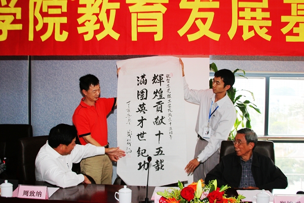 座谈会由院党委书记周致纳主持,杨晓西院长向与会代表介绍了我院教育发展基金会的进展情况。老市长郑锦滔在会上指出,学院建院15年来,经历了从无到有、从小到大、从低到高的过程,取得了可喜的成就,为东莞培养了大批人才,学院成立教育发展基金会是一件功在当代、利在千秋的事情,他呼吁广大企业家积极支持我院的基金会建设和发展。郑老还欣然挥笔:“辉煌贡献十五载,满园英才世纪功”勉励我院。