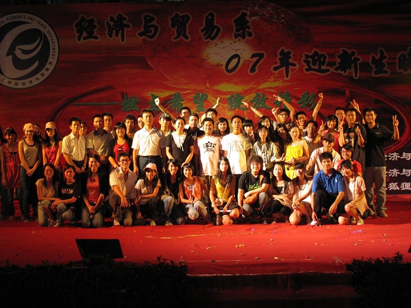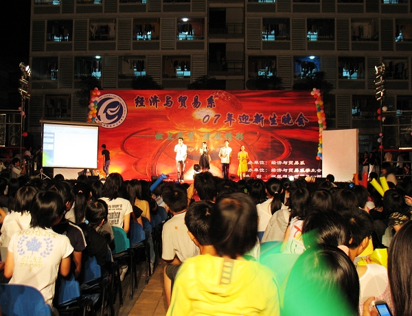 2007年10月14日晚上, 经济与贸易系在学院下沉广场举办了一场别开生面的07年迎新生晚会。出席本次晚会的有经贸系于丽敏主任、杨继学副主任、杨万江副书记等领导以及经贸系、团委和艺术系老师和各系的学生会主席。经贸系主任于丽敏教授在晚会上讲了话,对新生们的到来表示欢迎。