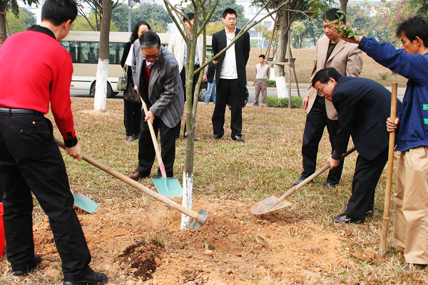 在院士林里,杨福家院士亲手栽种桂花树,以志留念。杨福家院士认真地为桂花树苗培土,细心地给桂花树苗浇水。