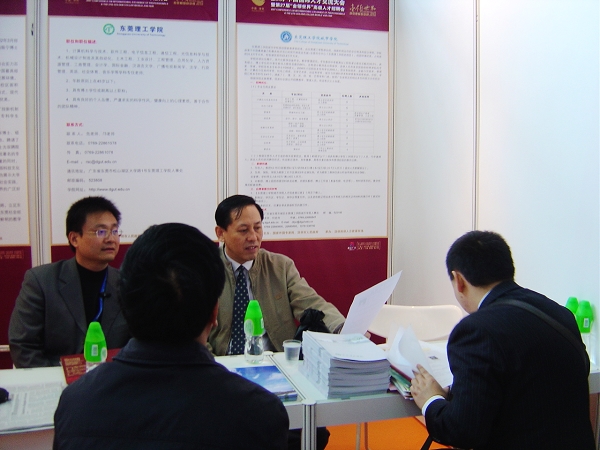 11月29日,人事处工作人员已进入会场,开始了紧张而有序的布展工作。30日上午9点,交流大会正式开始。我院展台吸引了不少海内外高层次人才前来咨询。我院工作人员向咨询者分发了学院宣传册、2008年招聘信息,并耐心细致地向他们介绍了东莞市以及学院基本情况、人才引进政策、发展前景。