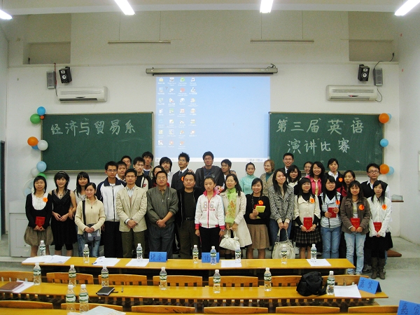 为了促进经贸系的学风建设,提高学生的英语口语水平,丰富同学们的校园文化生活,为大家提供一个锻炼自我的舞台,同时培养学生自觉学习的良好习惯,经济与贸易系于2007年 11月29日晚举行了“经济与贸易系第三届英语演讲比赛”。
