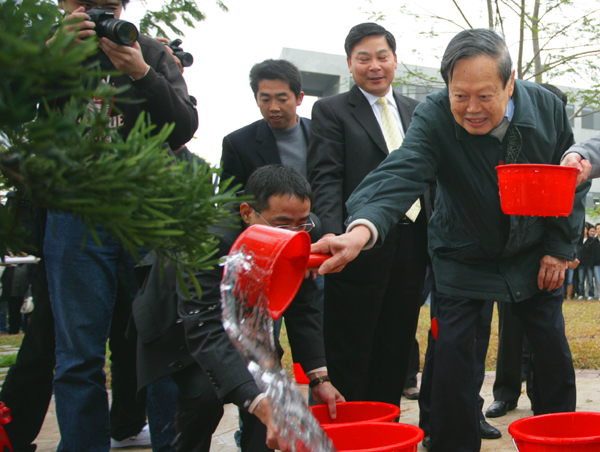 杨振宁博士细心地给罗汉松培上土,然后浇水。他很有兴致地说:“我过两年还要来看看这棵树长得怎么样。”