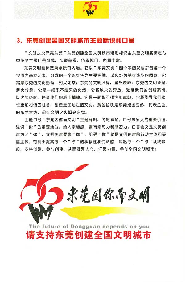 尊敬的市民朋友,文明城市呼唤文明市民,文明市民创造文明城市!你的每一份努力,都让我们的城市离文明更进了一步;你的每一份热情,都会激起更多人文明意识的诞生和责任意识的增强。让我们携起手来,共同努力,为把东莞创建成为全国文明城市、和谐幸福家园贡献自己的力量!