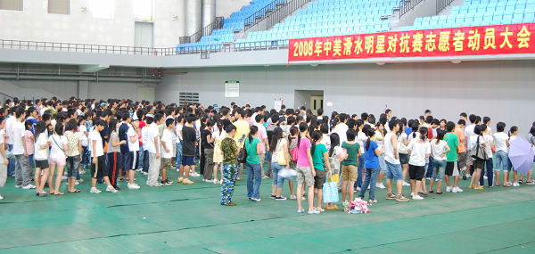 9月25日下午,学校体育馆人声鼎沸,欢乐飞扬,“长城世界杯”2008中美滑水明星对抗赛志愿者启动仪式在此隆重举行。松山湖有关部门和我校团委相关负责人,以及即将为中美滑水对抗赛服务的500多名志愿者参加了启动仪式。